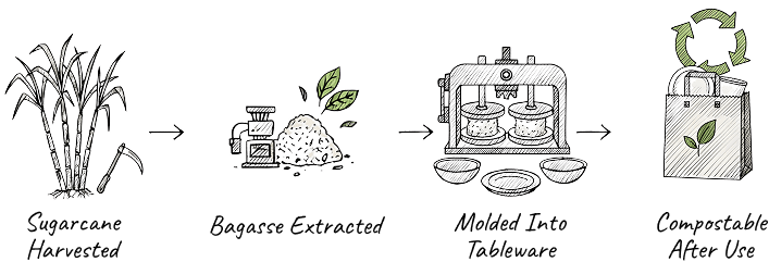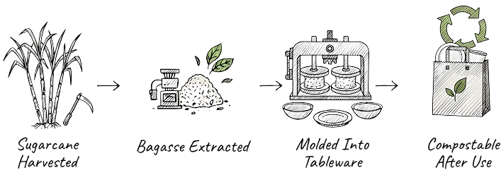 We make plates and bowls from sugarcane bagasse, and we craft cutlery from natural wood to ensure eco-friendly dining.